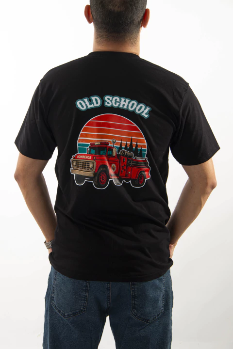 En el frente, un detalle minimalista con el logo Código 4 en el pecho. En la espalda, el protagonista: un camión de bomberos vintage con fondo retro de franjas en tonos cálidos y pinos al horizonte, junto a la frase “OLD SCHOOL”, destacando que lo tradicional sigue vigente.